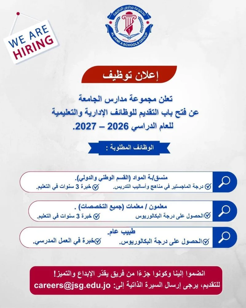 يبدأ اعتبارًا من يوم الأربعاء 25/2/2026 استقبال طلبات التوظيف، وذلك وفقًا للشواغر والتخصصات التالية: